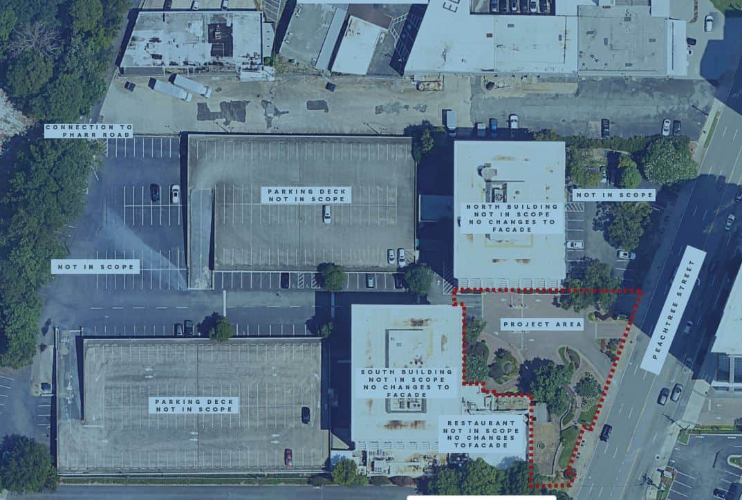 The applicant proposes to reconfigure and re-landscape the exterior portion facing Peachtree in front of the South Building of the Buckhead Center complex. Specifically, they would like to change the driveway portion, truncating 3 curb cuts down to one and alter how vehicles transit the site to the parking area in rear and the rideshare pickup in front. This will remove 3 parking spaces located between the building and the street. In place of that, the new rideshare pickup area will include new seating and new shade trees. Additionally, the applicant will reconfigure pedestrian walkways and patios within the site, slightly increasing outdoor seating for building occupants. Overall, the proposed changes will result in a net decrease of 1600 sq feet of impervious surfaces in the renovated area.